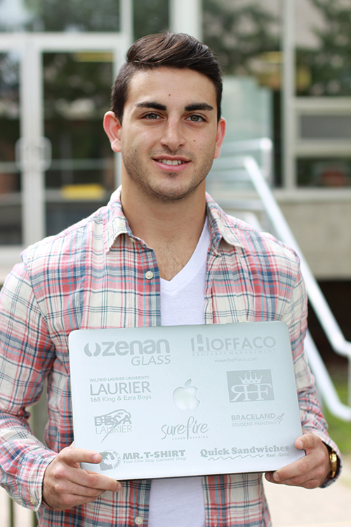 Zack Hornarvar found himself in a tough predicament. He was enrolled in a special Harvard program at Laurier for computer programming with tough courses and tight deadlines. As if his old laptop wasn’t hard enough to work on, its days were numbered and died on him completely. Zack didn’t have the funds or the time to wait for a new laptop. He decided to take an original entrepreneurial approach and sell sponsorships for laser etched logos on his future laptop. Then to have stories and articles written as well as social media to advetise the project. Zenan jumped on board when they heard that they could help this student and contributed a large portion of the funds needed to purchase the laptop. “We were more concerned with the student getting his laptop and continuing with his studies. We have kids in university and understand not only the cost but how important it is to have an up to date working computer. For us it’s not about the publicity.” Said Cindy Staffieri from Zenan Glass. The local paper wrote an online article that you can access here: http://www.thecord.ca/laurier-student-fundraises-for-his-future/ . Below are some photos of Zack and his completed laptop with Cindy Staffieri and Ivan Rebello from Zenan.