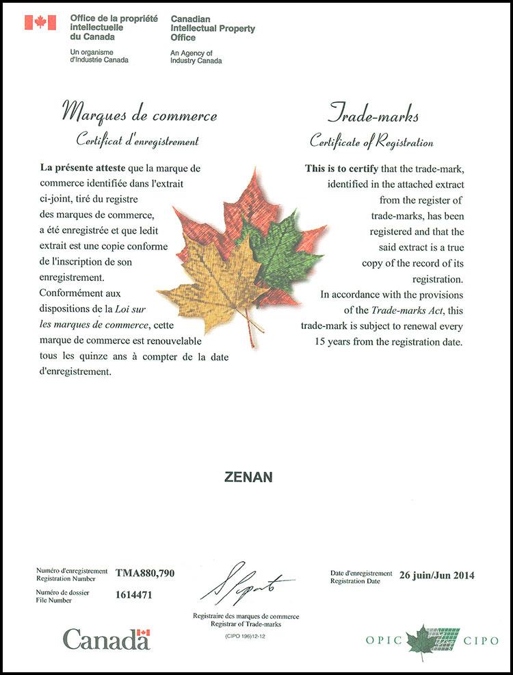 Zenan Canadian Trademark